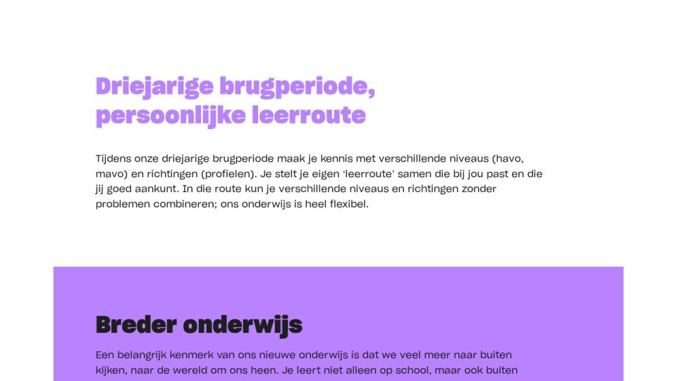 Tijdens onze driejarige brugperiode maak je kennis met verschillende niveaus (havo, mavo) en richtingen (profielen). Je stelt je eigen ‘leerroute’ samen die bij jou past en die jij goed aankunt. In die route kun je verschillende niveaus en richtingen zonder problemen combineren; ons onderwijs is heel flexibel.